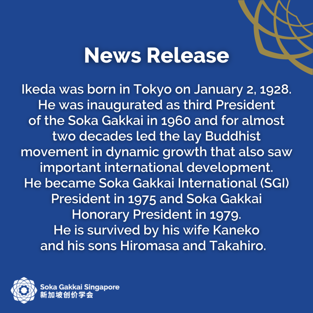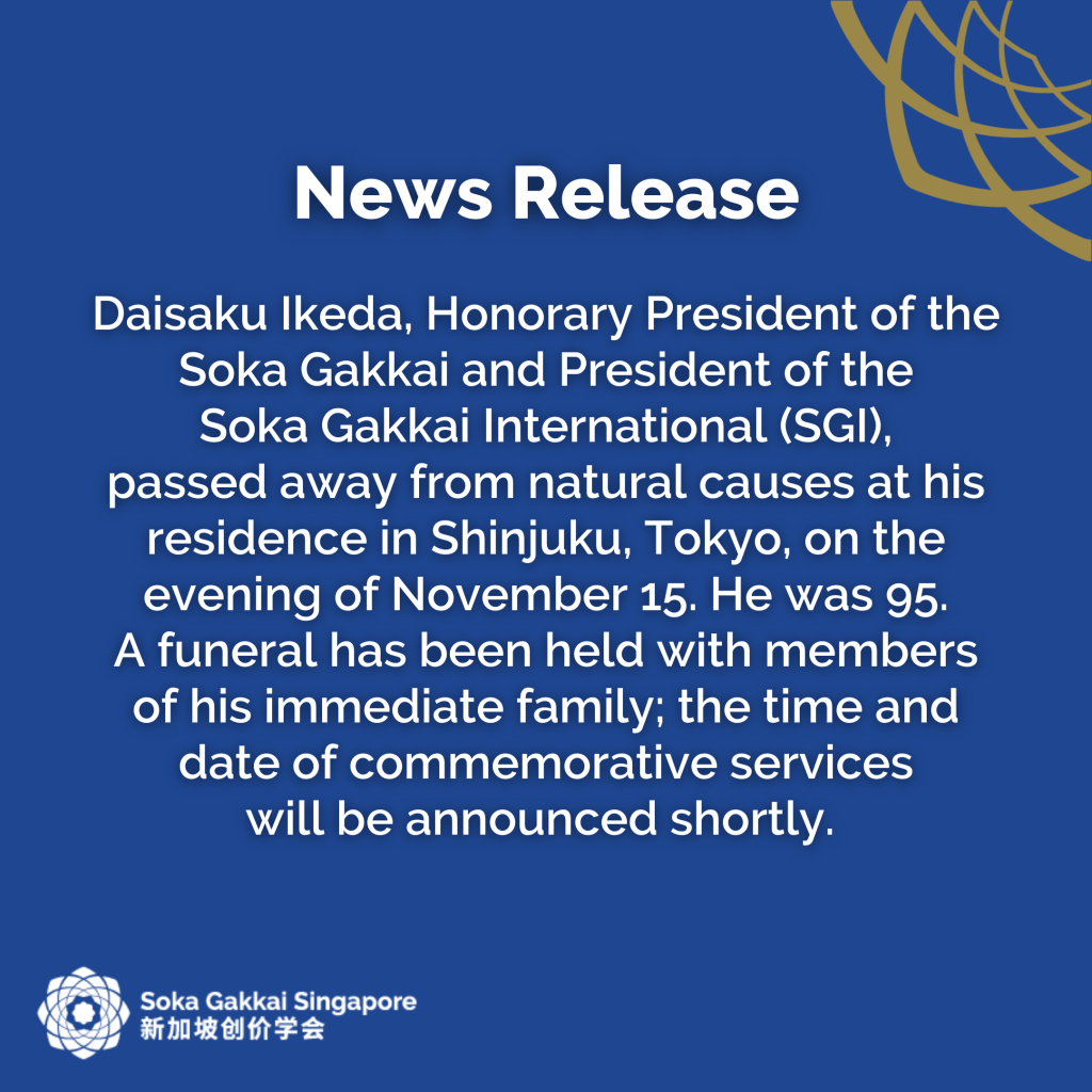Daisaku Ikeda, Honorary President of the Soka Gakkai and President of the Soka Gakkai International (SGI), passed away from natural causes at his residence in Shinjuku, Tokyo, on the evening of November 15. He was 95. A funeral has been held with members of his immediate family; the time and date of commemorative services will be announced shortly.
