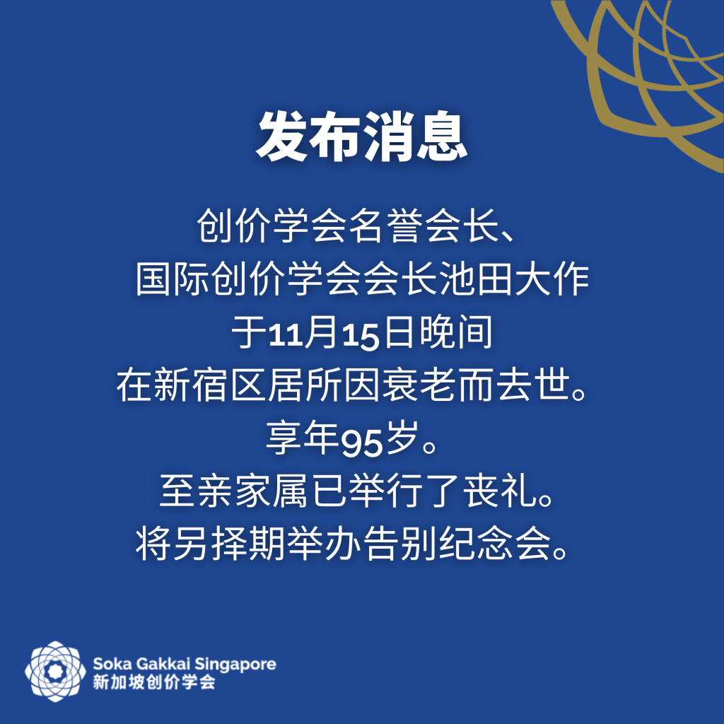 创价学会名誉会长、国际创价学会会长池田大作于11月15日晚间,在东京新宿区居所因年老而安详去世。享耆寿95岁。至亲家属已举行了丧礼。将另择期举办告别纪念会。