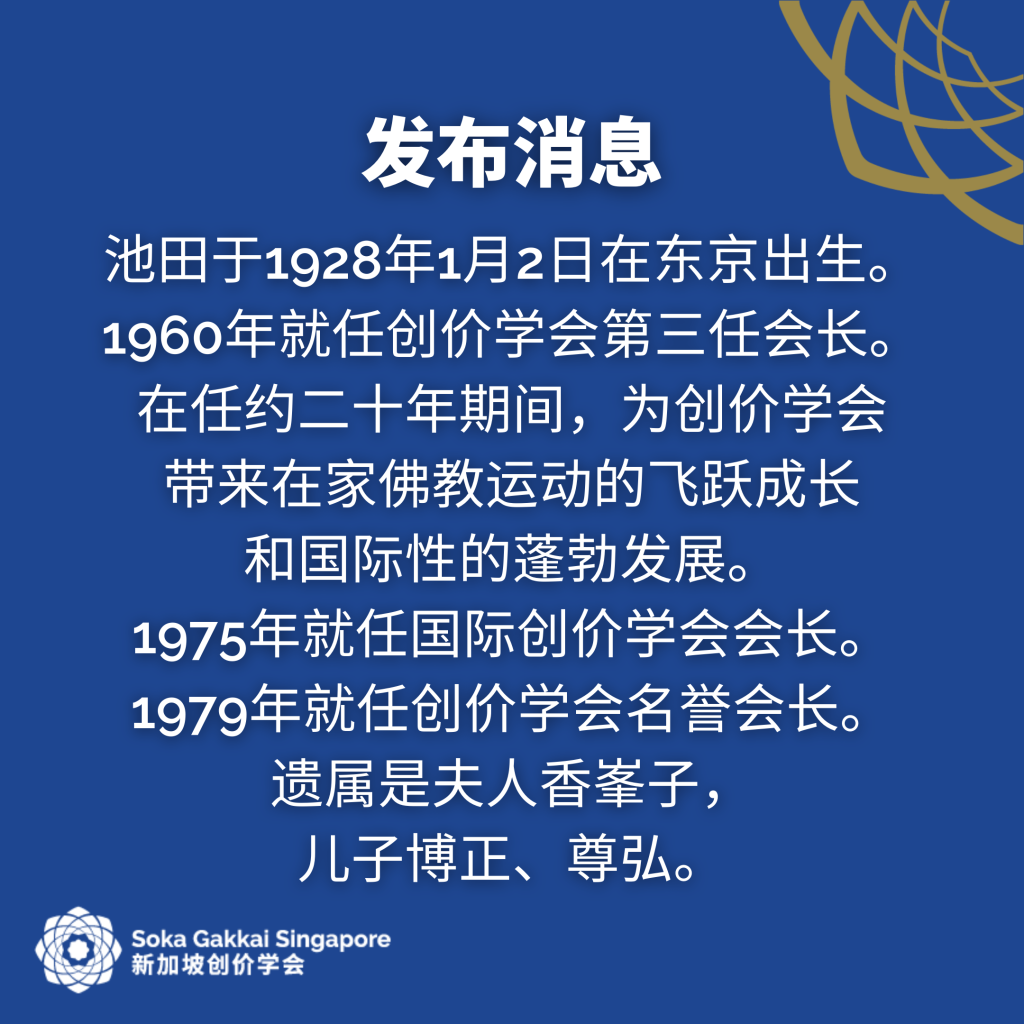 创价学会会长原田稔及池田先生的儿子创价学会常务副会长池田博正发布了池田先生辞世的消息。此影片开放观赏至2023年11月30日的日本时间晚间11点59分为止,现提供数个语言字幕,请使用CC字幕功能自行切换字幕。