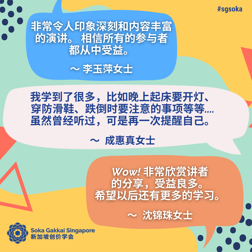 “Wow! I really appreciate the speaker’s sharing. I have benefitted greatly and hope to have more of such talks in the future.”