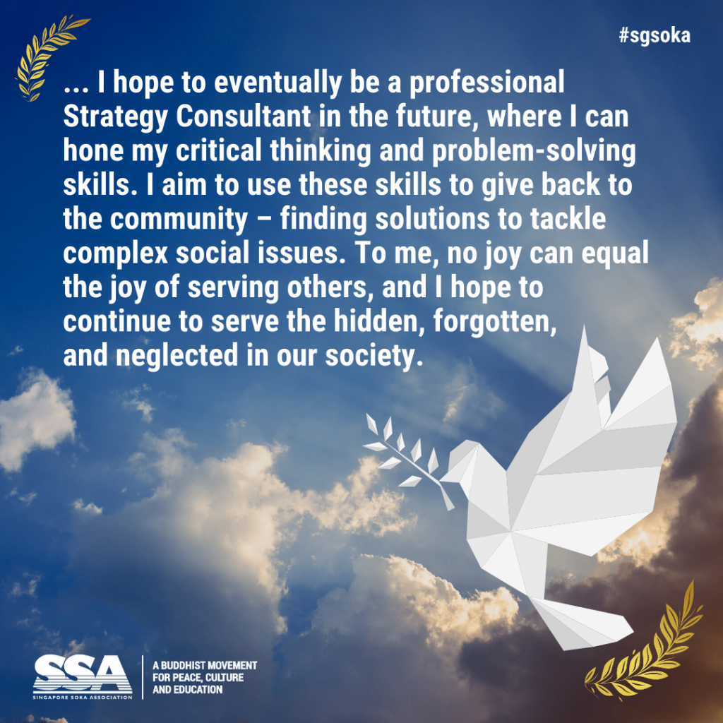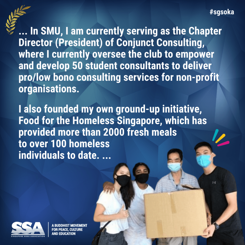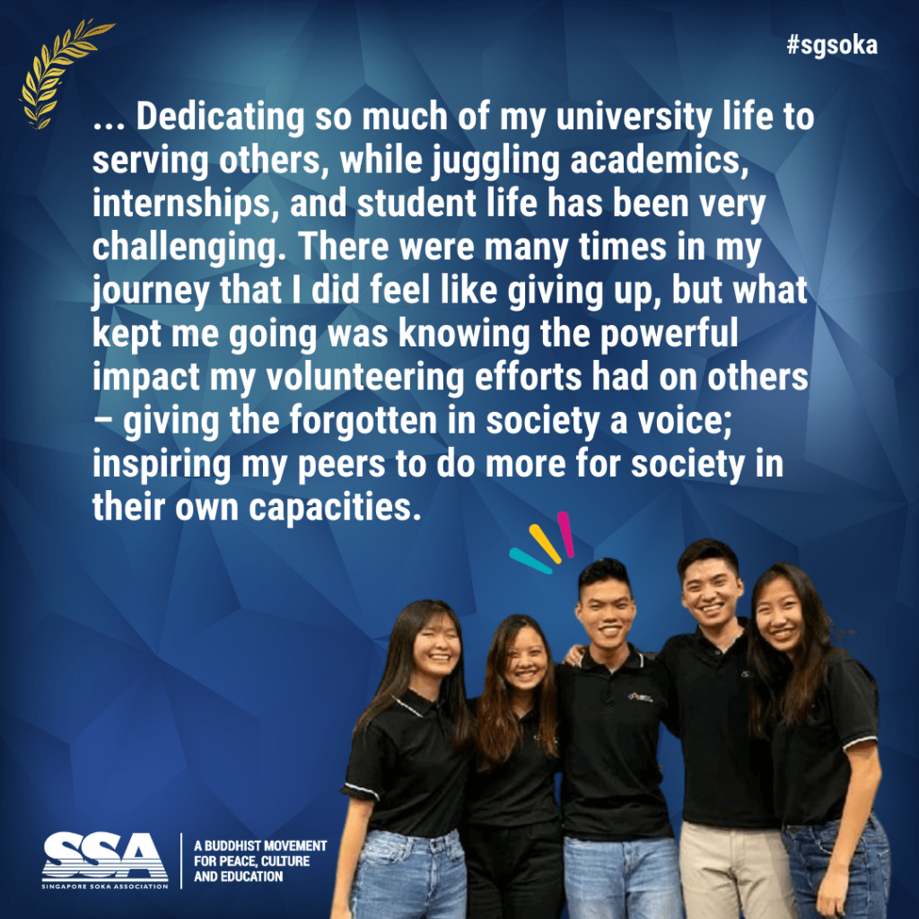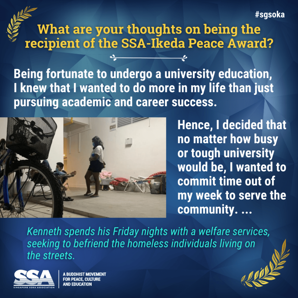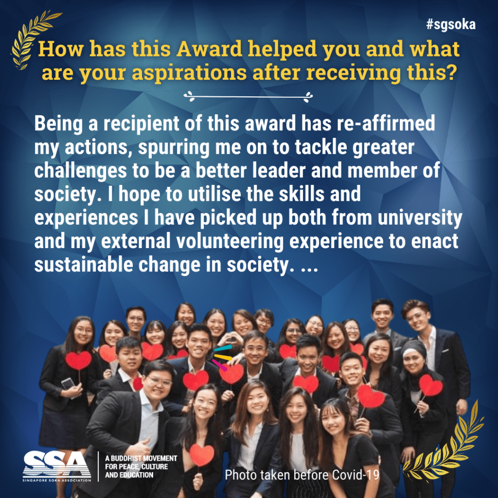 This year marks the 13th year since the establishment of the SSA-Ikeda Peace Award with the Singapore Management University (SMU) in year 2008. The annual Award recognises students who are committed to the spirit of volunteerism and have made significant contributions to the University or community at large through volunteer welfare organisations’ activities.