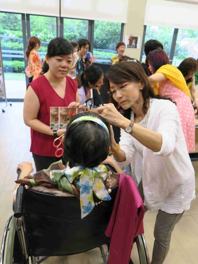 As the weekend coincided with Mother’s Day, volunteers from the SSA Women Division Passion Group and Young Women Division Bluebelle Group (both SSA function Groups with members who have interest in make-up), transported the senior citizens back to the time of their youth through a wide selection of retro-themed accessories and make-up. Individual makeover photographs were also presented to them at the end of the session as souvenirs.