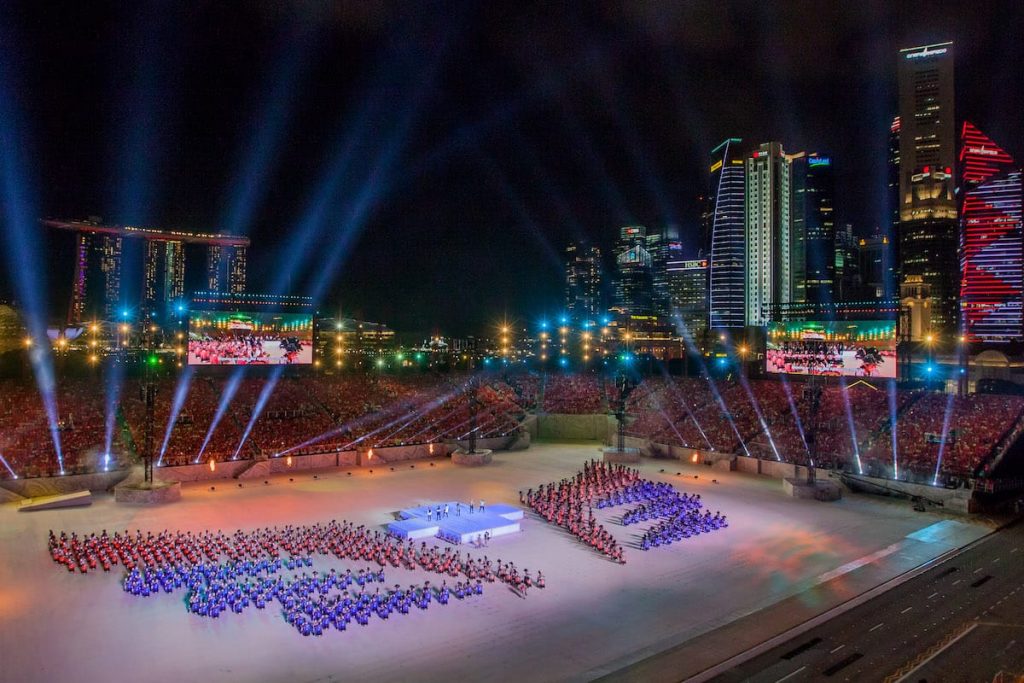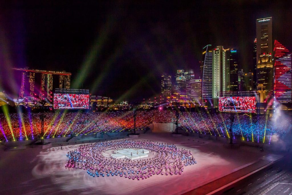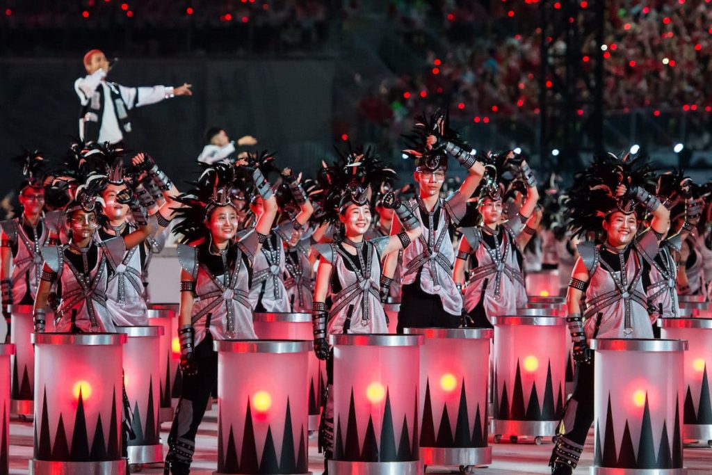 Performing with LED drums that light up in synchrony with the audience’s LED wristbands, the mass display item was an emotive act that explored four stories of different Singaporeans through the medium of film. These stories feature protagonists who have shown resilience and courage in overcoming their fears and challenges. The stories also depict Singaporeans coming together, to help one another overcome adversities, and to build an inclusive and caring society.