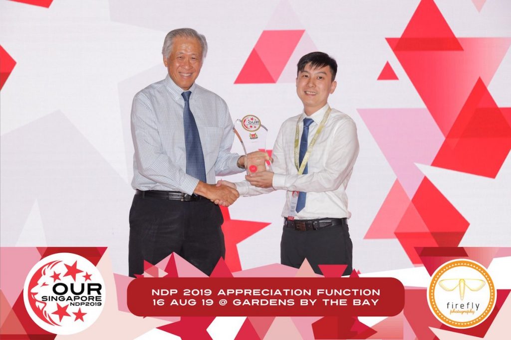 On 16 August, NDP 2019 Chairperson Ang Meng Chang received on behalf of SSA the NDP 2019 Appreciation Award from Minister of Defence, Dr Ng Eng Hen. The event was held at Gardens by the Bay under the invitation of Chairman of NDP 2019 EXCO, Brigadier-General Yew Chee Leung.