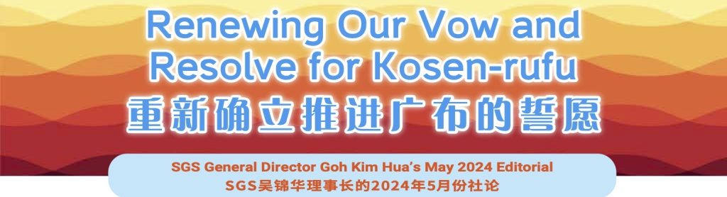 Armed with the Daishonin’s life-transforming teaching of “voluntarily assuming the appropriate karma”, we are sure to live lives of no regret, exerting ourselves in the two ways of practice and study, and striving in the propagation of the Mystic Law for the happiness of others. Based on this vow as Sensei’s disciples, we are able to manifest our innate potential to the fullest and live this year’s motto of “Creating our history of kosen-rufu”.