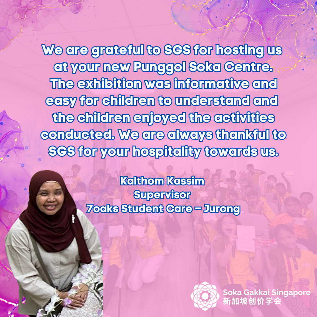 On 6 and 13 June, Soka Volunteers Group(SVG) organised a June Holiday Bonding Program for Students of 7oaks Student Care Centre from Jurong and Bedok. Held at Punggol Soka Centre, the day’s activities saw these children touring the Seeds of Hope and Action exhibition, engaging in bonding games, having quizzes and penning of appreciation notes to their family and friends.