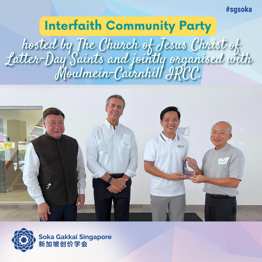 On 29 July, Mr Tay and SGS representatives called on friends at the Baha’i Centre in the spirit of strengthening friendship with the Baha’i community, and most recently on 6 August, Mr Tay and Honorary Secretary Mr Yong Kim San attended an interfaith community party hosted by The Church of Jesus Christ of Latter-Day Saints and jointly organised with Moulmein-Cairnhill IRCC. Special guest for the event was Minister of State, Ministry of Culture, Community and Youth & Ministry of Trade and Industry Mr Alvin Tan.