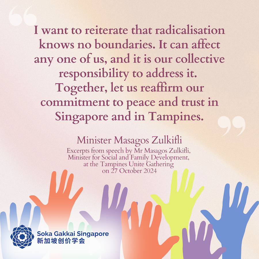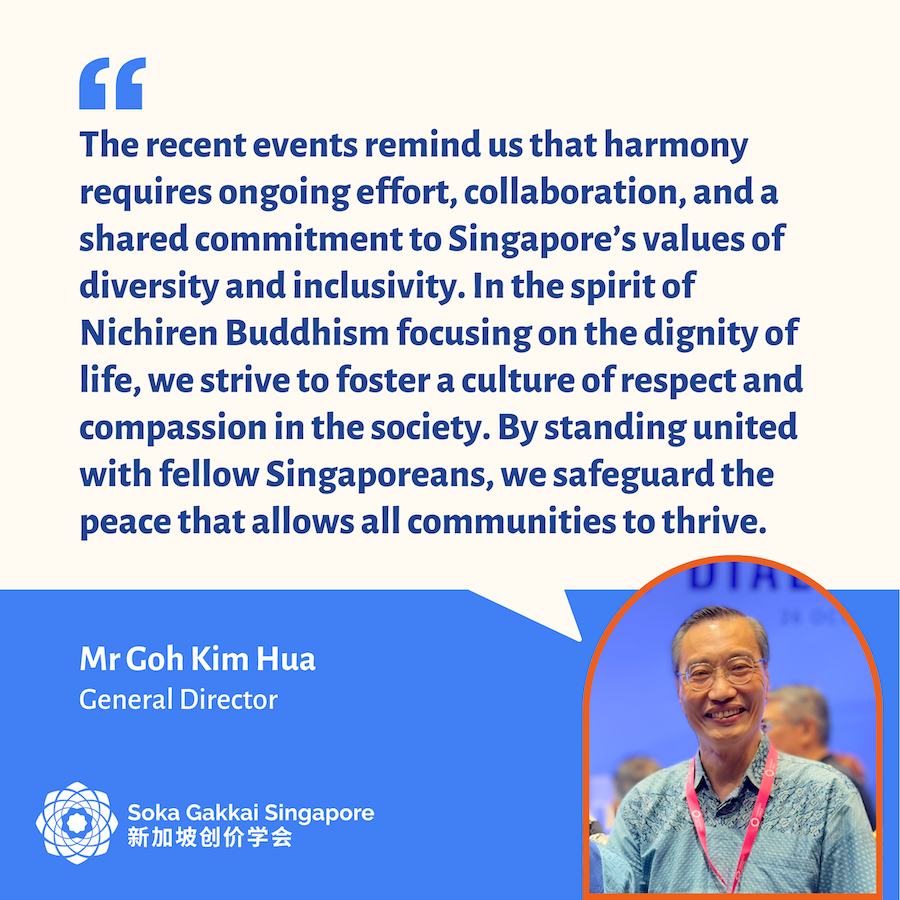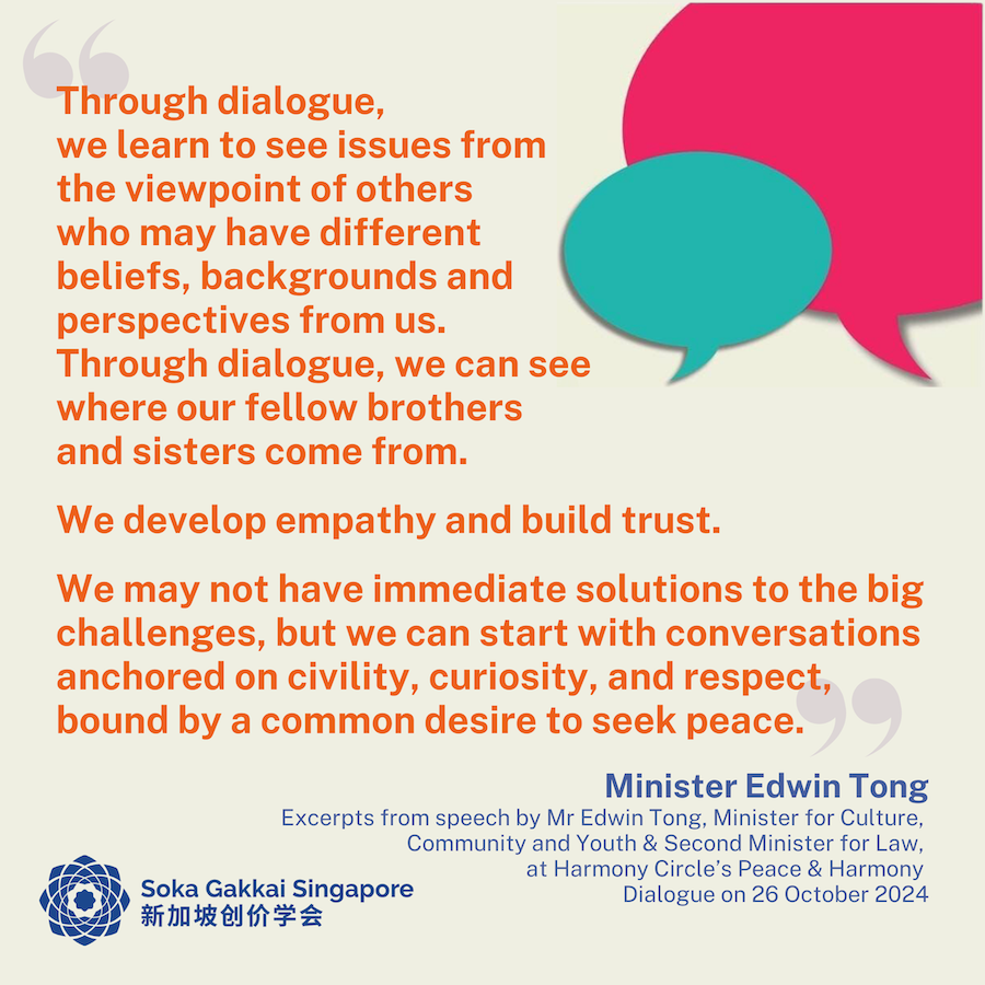On October 26, a team led by General Director Goh Kim Hua and Chairman Tay Eng Kiat attended the Peace and Harmony Dialogue held at Singapore Management University, with Minister for Culture, Community, and Youth, Mr Edwin Tong, as the Guest of Honour. The event featured an interfaith prayer for peace in the Middle East conducted by the Inter-Religious Organization, followed by an interfaith dialogue on the significance of peace and harmony in Singapore.