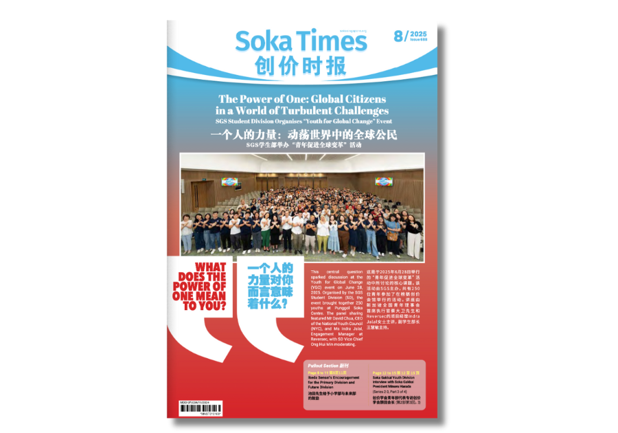 Soka Times is published once every fortnight (once a month with effect from January 2020) and carries news of SGS’s latest endeavours for peace, culture and education. Other highlights include articles on applying Buddhism in daily life and testimonies from members.