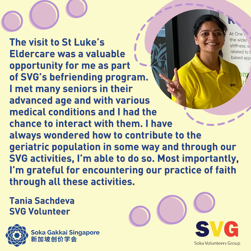 Soka Volunteers Group (SVG) members brought joy and warmth to elderly of SPD@Toa Payoh and St Luke’s Eldercare at One Punggol through a series of joyful and interactive activities on 29 September and 2 October respectively. The latter was the first of its regular befriending activity carried out with St Luke’s Eldercare at One Punggol.