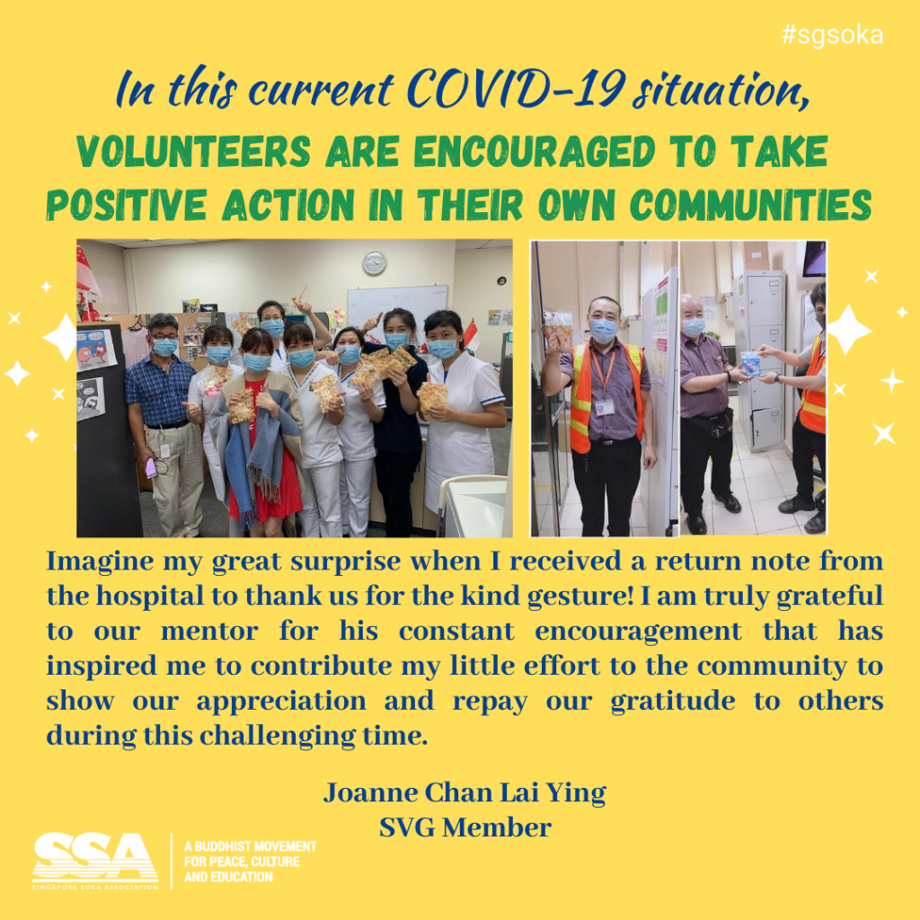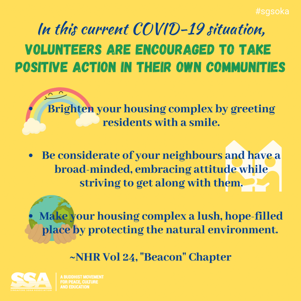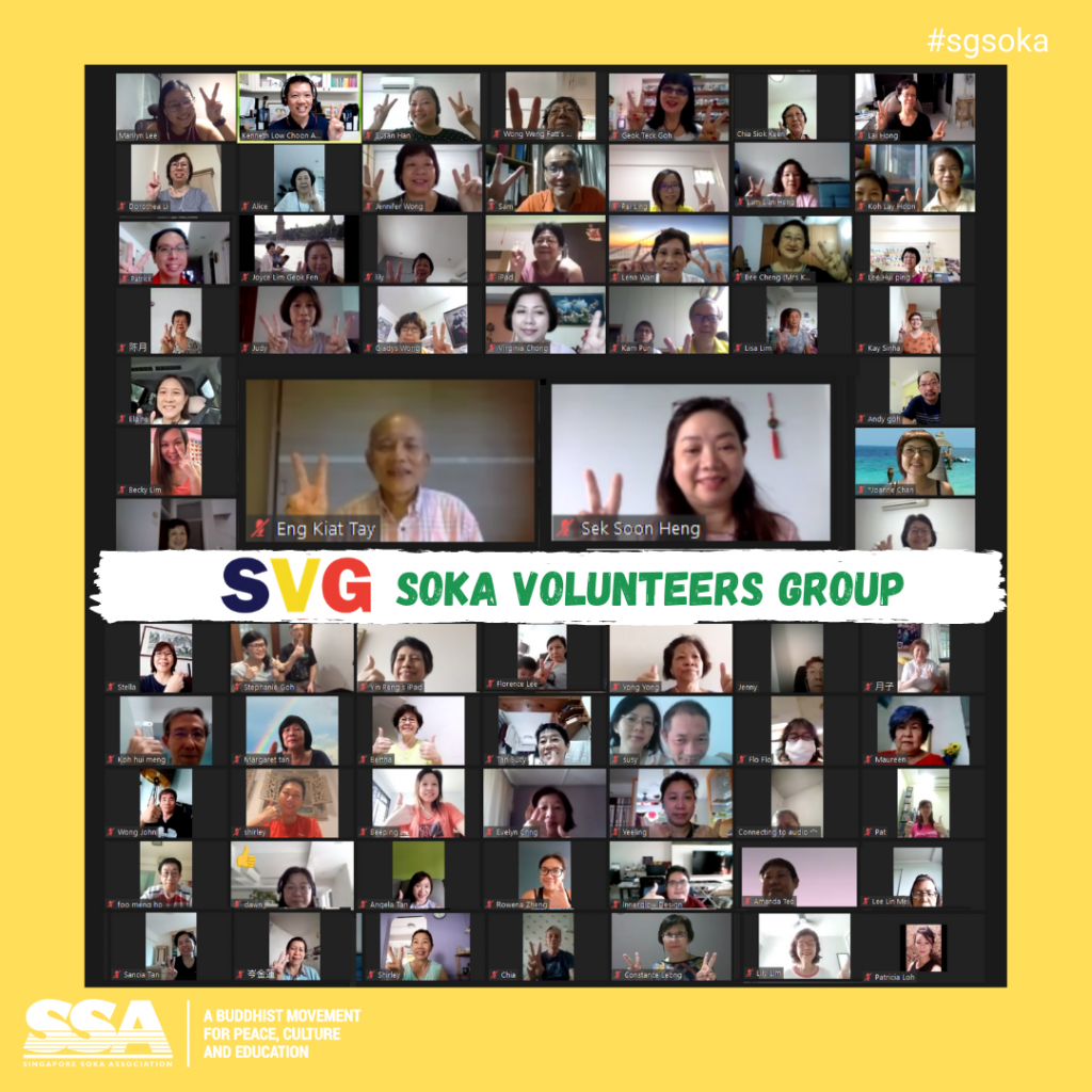 On 11 July, the Soka Volunteers Group (SVG) held an online meeting with some 100 members in attendance. SSA General Director Tay Eng Kiat and Women Division Chief Sek Soon Heng joined in the meeting to offer warm encouragement to everyone.
