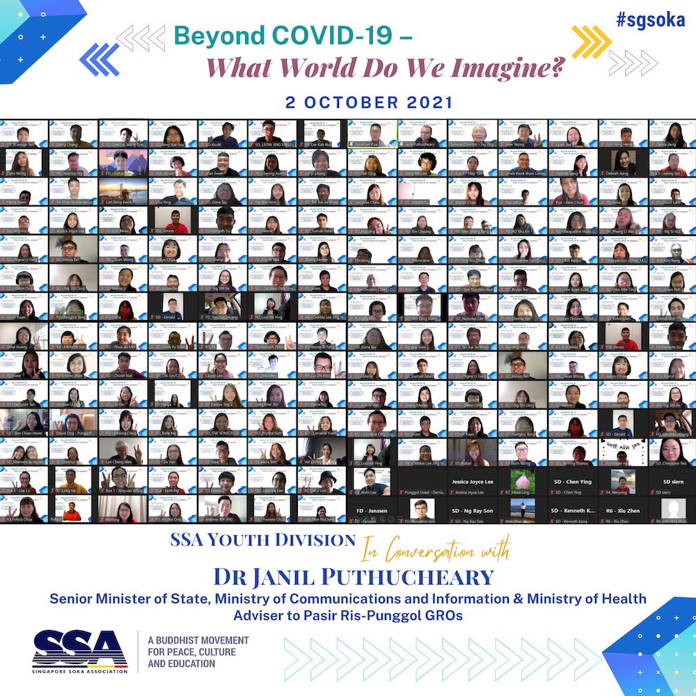 On 2 October, over 170 youths from the Singapore Soka Association (SSA) held a virtual dialogue session with Dr Janil Puthucheary, Senior Minister of State, Ministry of Communications and Information & Ministry of Health, Adviser to Pasir Ris-Punggol Grassroots Organisations (GROs). Prior to the dialogue session themed, “Beyond Covid-19 — What World Do We Imagine?”, SSA youths conducted various rounds of discussion to share observations on how Covid-19 had impacted areas of their lives and summarized three key areas – Resilience, Sustainability, and Inclusion and Diversity for an engaging discussion with Dr Janil.